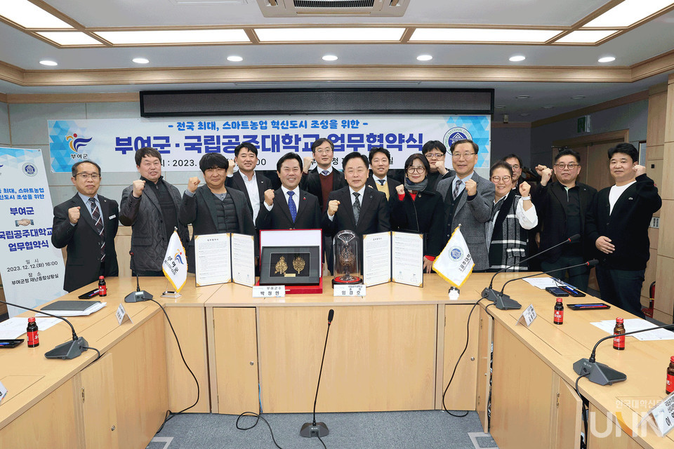 [한국대학신문 이정환 기자] 국립공주대학교(총장 임경호)는 12일 부여군 재난종합상황실에서 부여군(군수 박정현)과 생산연령인구 및 농업인구 감소, 고령화 등 지역위기 심화가 예견되는 상황에서, 농업환경변화에 능동적으로 대응하고자 스마트농업 전환·발전을 위한 관학 협력 업무협약을 체결했다고 13일 밝혔다.