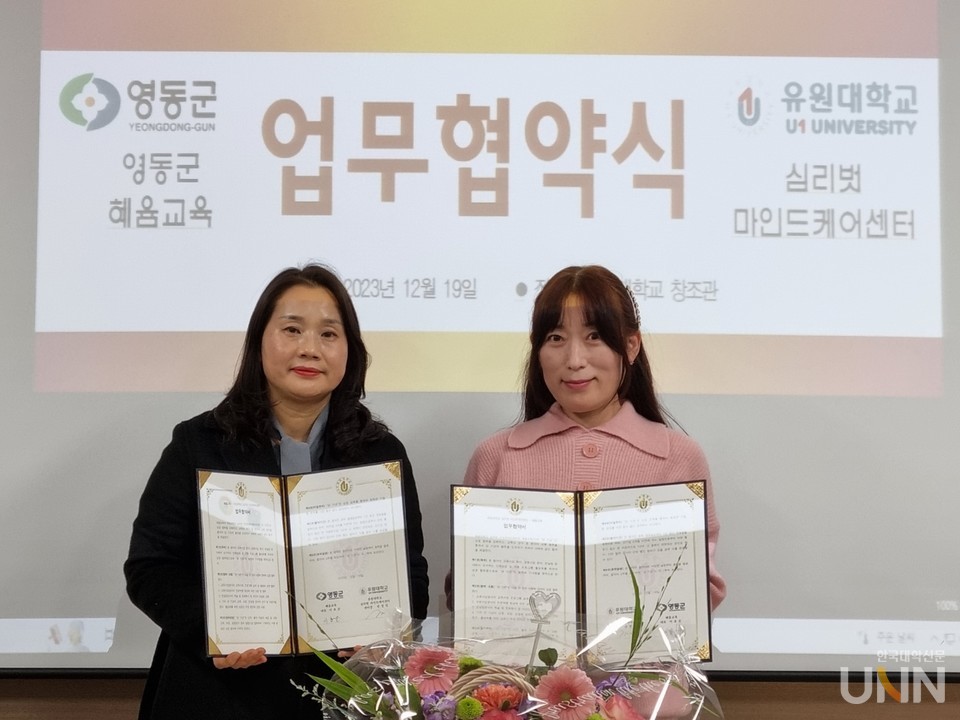 [한국대학신문 이정환 기자] 유원대학교 산학협력단 부설 심리벗 마인트케어센터(센터장 권정임)가 19일 혜윰교육(대표 이효순)과 교육사업 분야, 코칭사업 분야, 컨설팅 분야 인재양성 및 각종 프로그램 활성화를 위한 업무협약을 체결했다고 밝혔다.