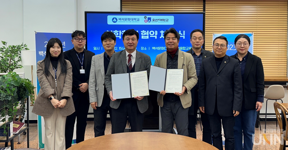 [한국대학신문 이정환 기자] 오산대학교(총장 허남윤)와 백석문화대학교(총장 송기신)는 지난 15일 백석문화대 창조관 창의융합센터에서 산·학·연·관 협력 공유·협업 활성화를 위한 기업협업센터(ICC) 간 업무협약을 체결하고, 양 대학 기업협업센터(ICC) 및 공용장비센터 간 우수성과 사례 및 기술을 교류하는 세미나를 개최했다.