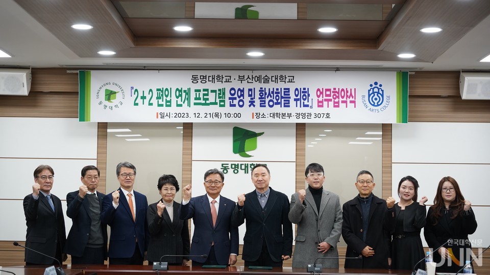 [한국대학신문 이정환 기자] 동명대학교(총장 전호환)와 부산예술대학(총장 안원철)은 교육과정 및 교육프로그램 공유·협력과 특별장학금 지급을 위한 협약을 21일 동명대에서 체결했다. 두 기관은 교육 제반 영역에서 중·장기적이고 폭넓은 인적·물적 교류 협력을 지속하기로 합의했다. 특히 유사 학과 간 긴밀한 협의체를 구축하여 향후 2+2 편입연계 프로그램 운영 및 활성화, 교육·실습 첨단 기자재 등 공동 활용을 통한 지역사회 혁신적 선도모델을 창출하기로 했다.