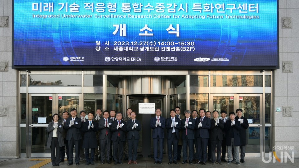 [한국대학신문 이정환 기자] 세종대학교(총장 배덕효) ‘미래 기술 적응형 통합수중감시’ 특화연구센터 개소식이 방위사업청(청장 엄동환)과 국방기술진흥연구소(소장 손재홍, 이하 국기연), 세종대 관계자들이 참석한 가운데 27일 열렸다.