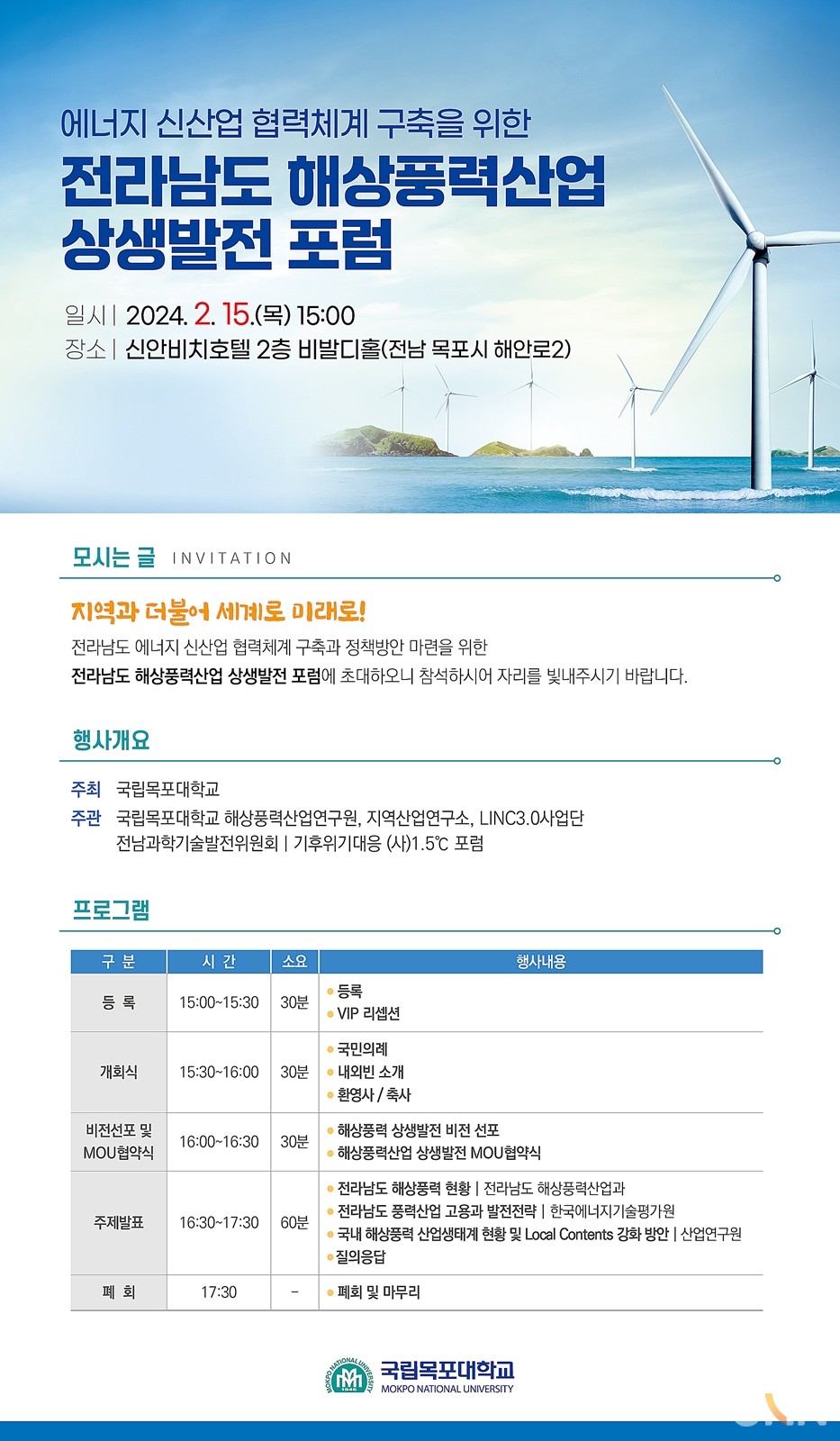 [한국대학신문 이정환 기자] 국립목포대학교(총장 송하철)가 오는 15일(목) 오후 3시 목포 신안비치호텔에서 전라남도 에너지신산업 발전을 위한 ‘전라남도 해상풍력산업 상생발전 포럼’을 개최한다고 밝혔다.
