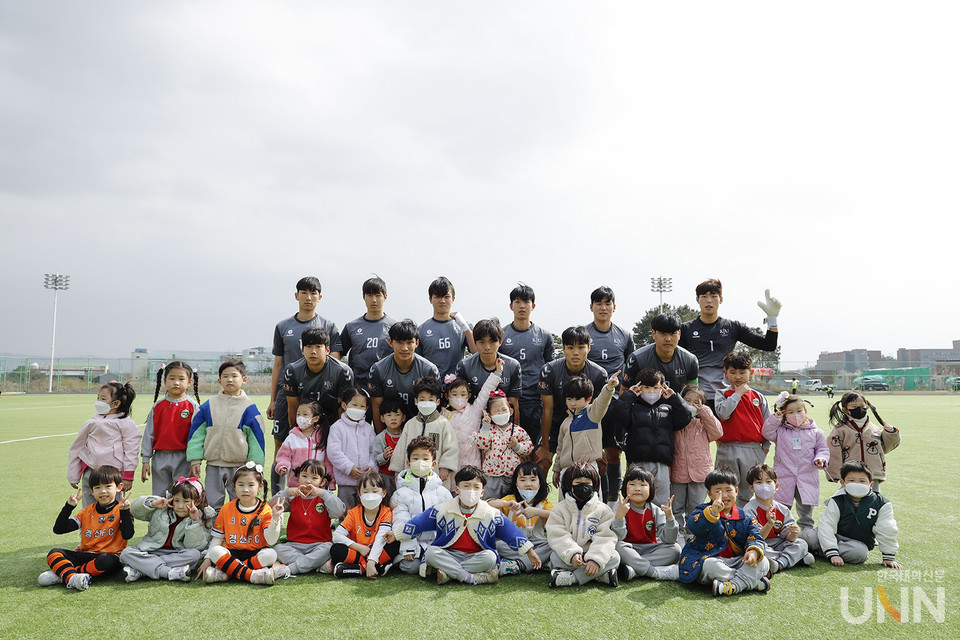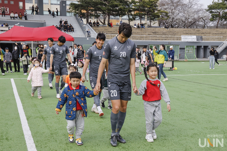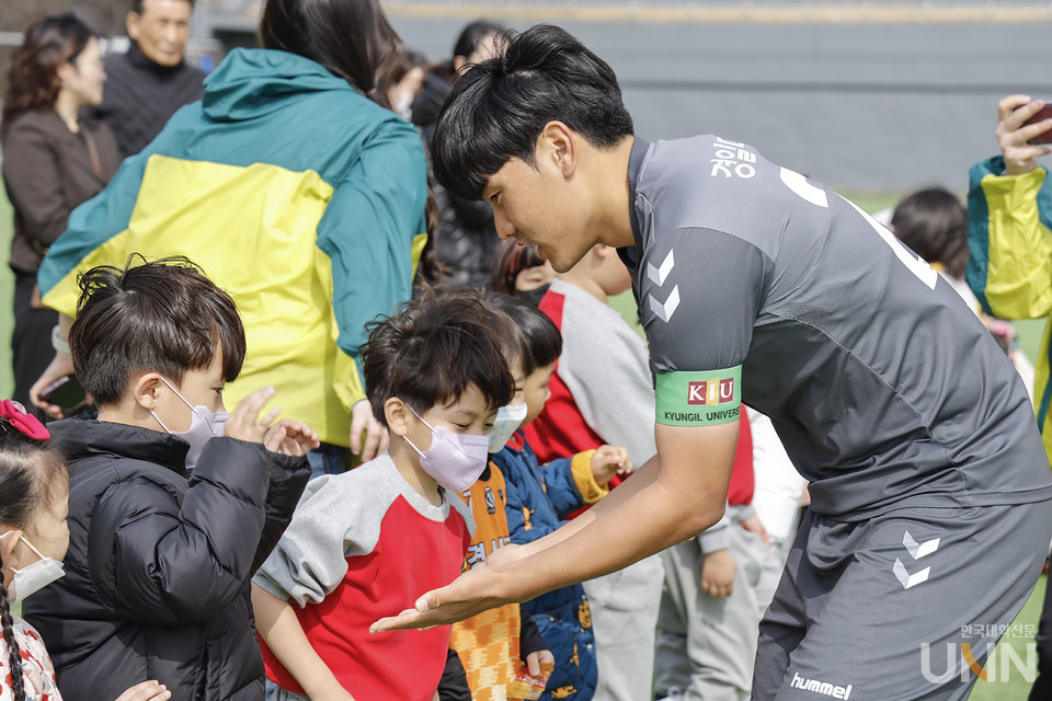 이날 대학 U리그 개막전에는 경북 경산시 하양읍에 위치한 ‘예인유치원’의 원아들과 학부모들을 초대해 △선수 에스코트 입장 △승리의 하이파이브 △하프타임 축구경기 △개막전 시축 △기념촬영 등의 이벤트를 진행했다.
