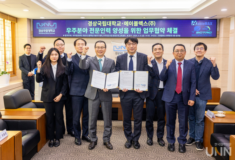 [한국대학신문 이정환 기자] 경상국립대학교(GNU·총장 권순기)는 경상남도의 우주산업 활성화를 위해 우주항공 설계·해석 전문 소프트웨어 공급사인 에이블맥스(주)(대표이사 박정혁, 이하 에이블맥스)와 ‘우주분야 전문인력양성 교육체계’를 구축하기 위한 업무협약(MOU)을 5일 오후 가좌캠퍼스 대학본관 접견실에서 체결했다.