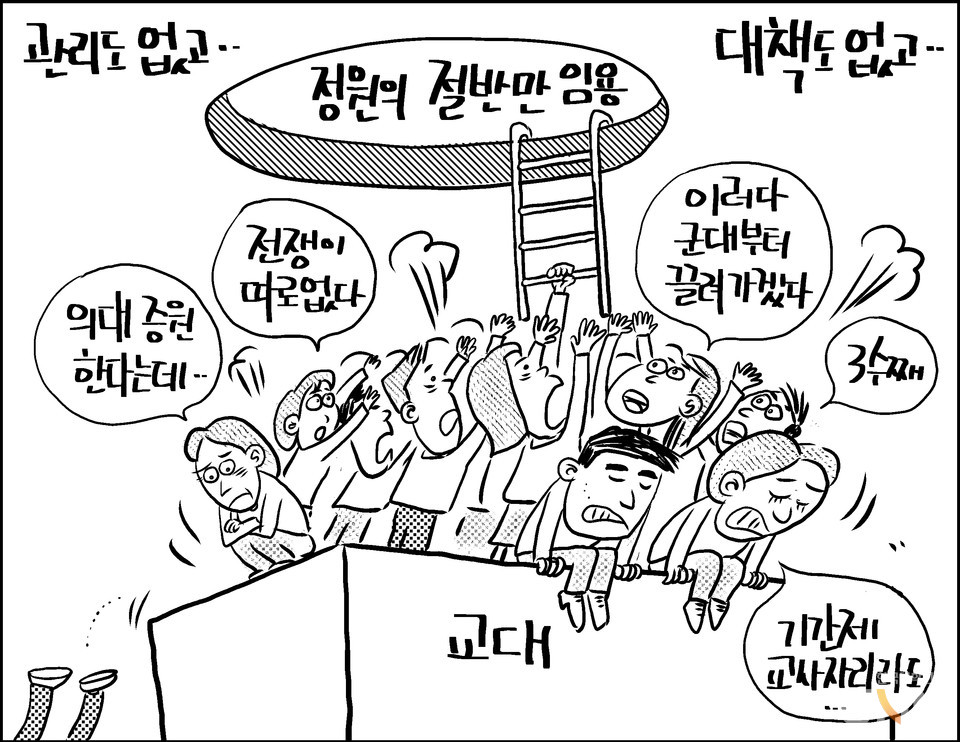 장영우 화백 <한국대학신문> 관련기사 내년부터 교대 정원 12% 감축…‘임용 대란’은 여전할 전망 교대 나와도 임용고사 합격률 절반에 그쳐…“교원 수급 방안 마련해야” 키워드 #대학세평 #장영우 #교대 #교육대학 #정원 감축 #임용 대란 한국대학신문 news@unn.net 다른기사 보기 저작권자 © 한국대학신문 무단전재 및 재배포 금지 댓글삭제 삭제한 댓글은 다시 복구할 수 없습니다. 그래도 삭제하시겠습니까? 비밀번호 닫기 이 기사에 대한 당신의 생각은? 0 댓글 접기 댓글입력 권한이 없습니다. 댓글 내용입력 비회원 로그인 이름 비밀번호 댓글 내용입력 댓글쓰기 계정을 선택하시면 로그인·계정인증을 통해 댓글을 남기실 수 있습니다. 회원 로그인 이름 비밀번호 자동등록방지 로그인 옵션 창닫기
