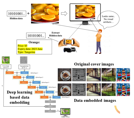 디스플레이-카메라 통신 기술에서 중요시되는 부분은 이미지에 포함되는 데이터로 인한 영상 왜곡이 사람 눈에 인지되지 않아야 하고, 카메라 촬영 때 발생할 수 있는 각종 영상 왜곡에서도 정확히 데이터만 추출할 수 있어야만 한다. 국립창원대 김병욱 교수 연구팀은 이 문제를 딥러닝 기술을 통해 접근했고, 영상 왜곡을 최소로 만들어주는 인코더, 정확한 데이터 검출이 가능한 디코더, 영상 촬영 시 발생할 수 있는 각종 노이즈를 고려한 노이즈 레이어를 디자인했다. 이로써 실제 디스플레이와 스마트폰 카메라를 통해 딥러닝 모델 학습 및 실험을 수행했고, 기존의 글로벌 최고 수준 연구결과 대비 더 높은 영상 화질과 데이터 검출 정확도 성능을 얻는 데 성공했다.