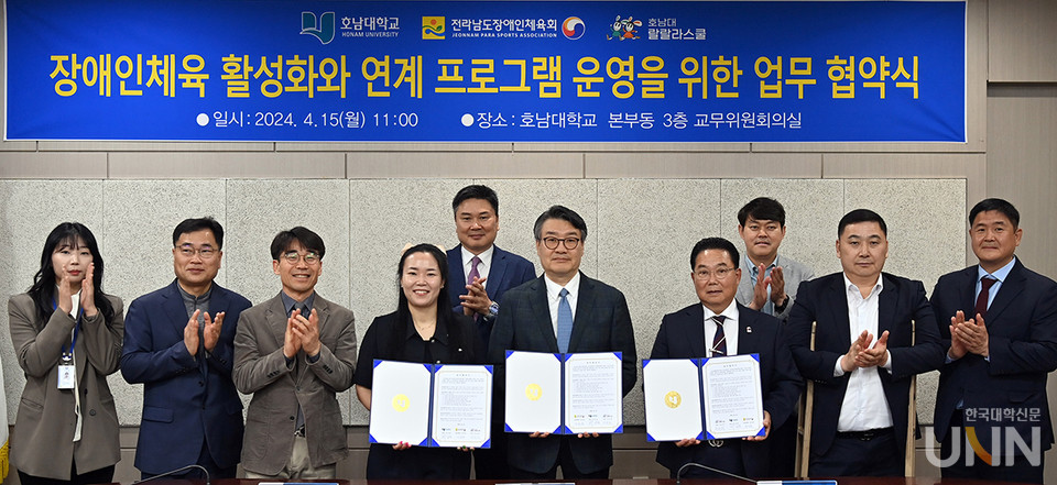 [한국대학신문 이정환 기자] 호남대학교(총장 박상철)는 15일 본부동 3층 교무위원회의실에서 전라남도장애인체육회(회장 김영록), 호남대랄랄라스쿨(대표 정윤희)과 업무협약을 체결, 상호 긴밀한 협력 체계를 구축하고 전라남도 장애인체육 활성화와 연계 프로그램 운영에 힘쓰기로 했다.