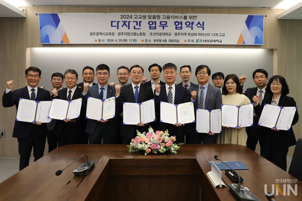 [한국대학신문 이정환 기자] 조선이공대학교(총장 조순계)가 광주광역시교육청, 광주지방고용노동청, 광주 13개 특성화고·마이스터고등학교와 함께 ‘고교생 맞춤형 고용서비스’ 업무 협약을 체결했다. 이번 협약은 고등학교를 졸업 직후 곧바로 취업을 희망하는 광주 고교생들에게 체계적인 직업교육과 취업상담을 지원을 하기 위해 마련된 것으로 광주에서 최초로 운영되는 ‘고교 재학생 맞춤형 고용서비스’의 첫 단추를 끼우게 됐다.
