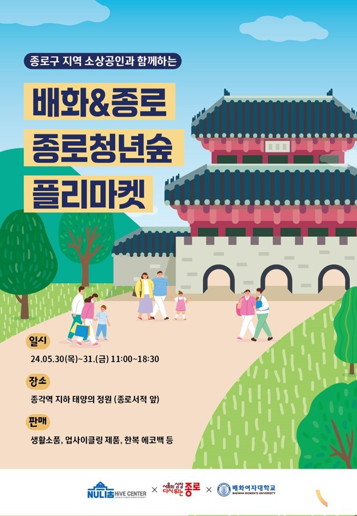 [한국대학신문 이정환 기자] 배화여자대학교(총장 신종식)와 종로구 컨소시엄의 NULI古HiVE(누리고하이브) 센터는 오는 30~31일 종각역 지하 ‘태양의 정원’에서 ‘종로청년숲 플리마켓’을 개최한다. 종로구청, 종로타워와 협력해 진행되는 플리마켓은 이틀간 오전 11시부터 오후 6시 30분까지 진행되며, 총 10개의 판매자 팀이 참여한다. 판매자들은 종로구 민관공학 지역협의체 활동을 함께하고 있는 종로구소상공인회, 창신솔루션앵커 등을 통해 모집됐다.