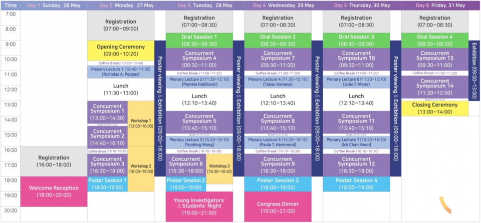 ‘생체재료의 융합: 미래 의료를 위한 비전(Convergence in Biomaterials: a vision for the future of healthcare)’이라는 주제로 대륙별 세계적 전문가들의 기조 강연 7편이 예정돼 있으며, 총 260개 이상의 심포지엄/ 구두 발표 세션, 워크숍 및 런천 세미나를 포함 4000여 편 이상의 발표가 진행될 예정이다.
