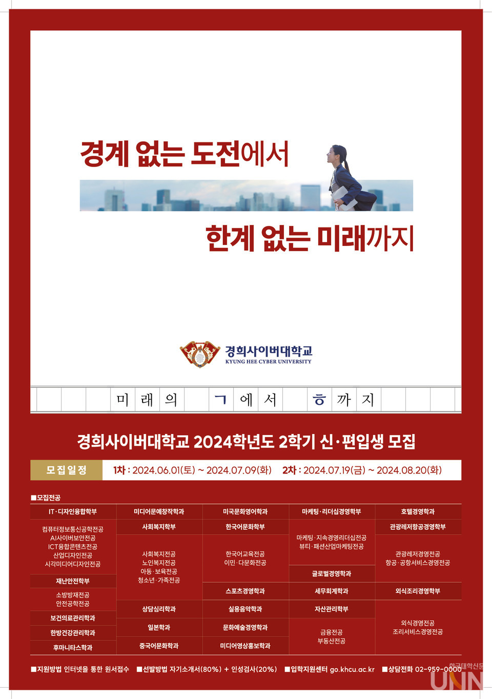 [한국대학신문 이정환 기자] 경희사이버대학교(총장 변창구)가 2024학년도 2학기 신·편입생 모집을 진행한다.