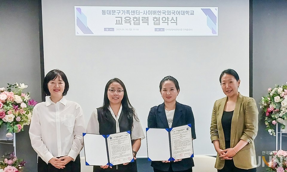 [한국대학신문 이정환 기자] 사이버한국외국어대학교(총장 장지호)는 지난 10일 동대문구가족센터(센터장 한미영)와 산업체 위탁교육 및 교육협력 협약을 체결했다.