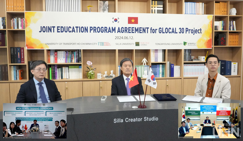 12일 신라대 허남식 총장과 동명대 전호환 총장, 호치민교통대 응웬 슈안 프엉 총장은 온라인을 통해 글로컬대학 30 사업의 성공적인 추진과 프랜차이즈형 해외캠퍼스 설립을 위한 협정식을 진행했다.