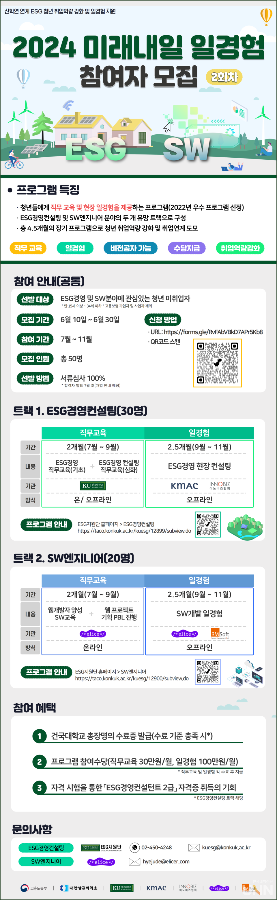 [한국대학신문 이정환 기자] 건국대학교 ESG지원단이 6월 30일까지 청년 직무역량 강화를 위한 ‘2024년 미래내일 일경험 사업 ESG 지원형’ 2회차 참여자를 모집한다.