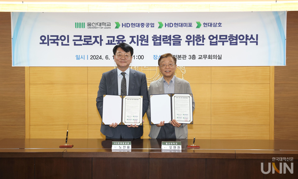 [한국대학신문 이정환 기자] 울산대학교(총장 오연천)는 19일 HD현대 조선 3사(HD현대중공업㈜, HD현대미포㈜, HD현대삼호㈜)와 외국인 근로자 교육 지원 협력을 위한 협약을 체결했다고 밝혔다.