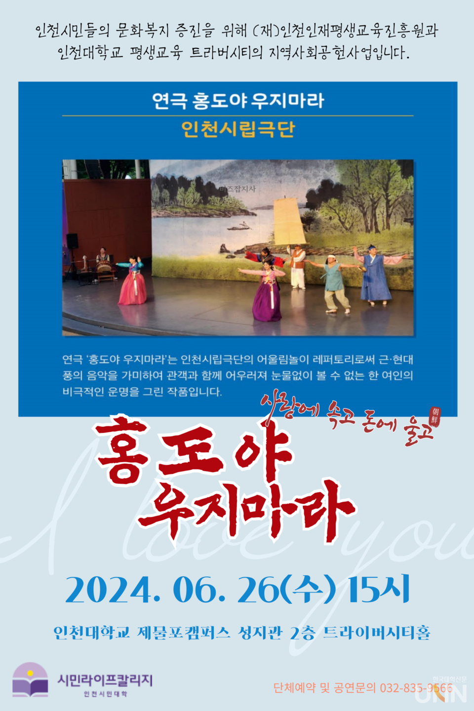 [한국대학신문 이정환 기자] 인천대학교 평생교육 트라이버시티는 인천시민을 대상으로 오는 26일 수요일 오후 3시 제물포캠퍼스 성지관 2층 트라이버시티홀에서 ‘시민초청 연극회 〈홍도야 우지마라〉 어울림 놀이를 개최한다고 밝혔다.