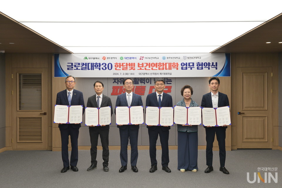 [한국대학신문 정수정 기자] 대전보건대학교(이병기 총장)는 대구시청 제1대회의실에서 글로컬대학30 본지정을 위한 ‘한달빌 글로컬보건연합대학 업무협약’을 체결했다.