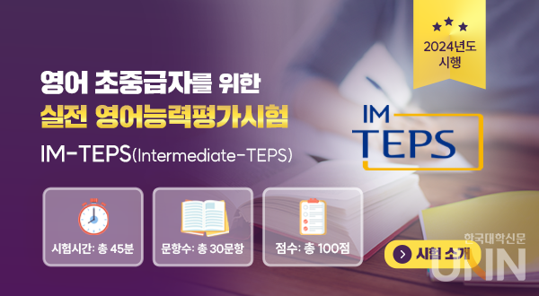 [한국대학신문 이정환 기자] 서울대학교 언어교육원(원장 장윤희)과 TEPS관리위원회(위원장 이준환)는 대한민국 중·고교생의 학습능력 신장을 위해 8월 24일(토) ‘제1회 IM-TEPS(아이엠텝스)’ 시험을 본격 시행한다.