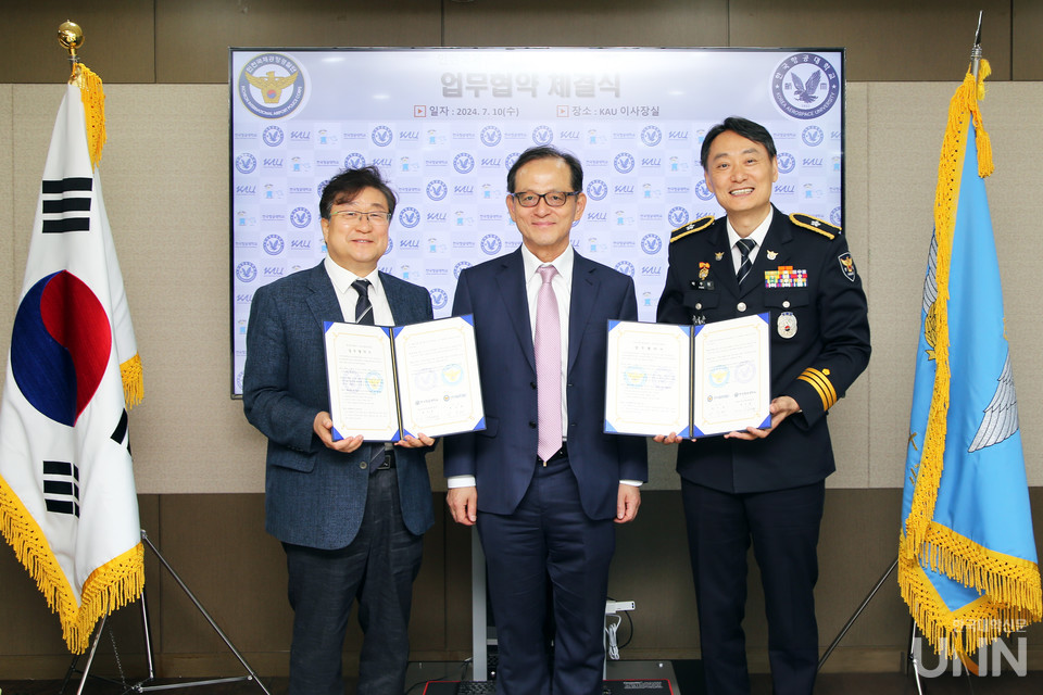 [한국대학신문 이정환 기자] 한국항공대학교와 인천국제공항경찰단이 10일 한국항공대 이사장실에서 업무협약(MOU)을 체결하고 항공보안 선진화를 위해 상호협력하기로 합의했다. 이번 협약은 한국항공대 항공우주정책대학원과 인천국제공항경찰단 간에 맺어졌으며, 협약식에는 한국항공대 허희영 총장, 황호원 항공우주정책대학원장과 인천국제공항경찰단 박우현 단장(경무관)을 비롯한 양 기관 관계자가 참석했다.