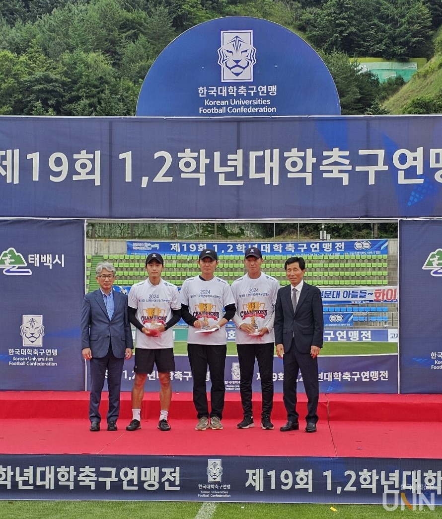 [한국대학신문 이정환 기자] 선문대학교(총장 문성제) 축구부가 강원 태백시 태백종합운동장에서 열린 ‘제19회 태백산기 1, 2학년 대학축구연맹전’에서 우승을 차지했다. 선문대는 3년 연속 우승으로 대학 축구 최강팀임을 또다시 보여줬다.