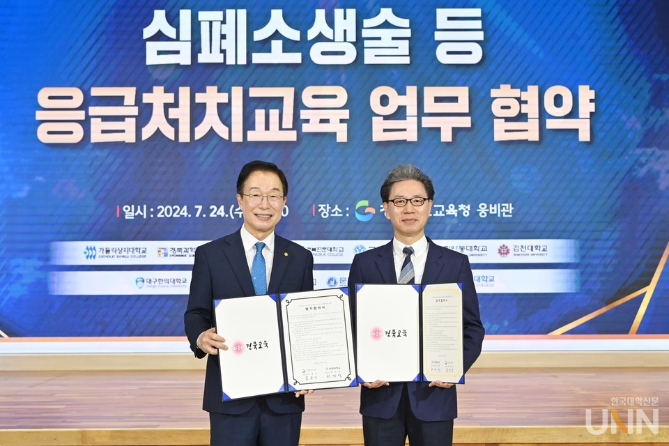 [한국대학신문 정수정 기자] 포항대학교는(총장 하민영) 지난 24일 경북교육청 본청 웅비관에서 경북지역 13개 대학교와 함께 ‘심폐소생술 등 응급처치 교육업무 협약’을 체결했다.