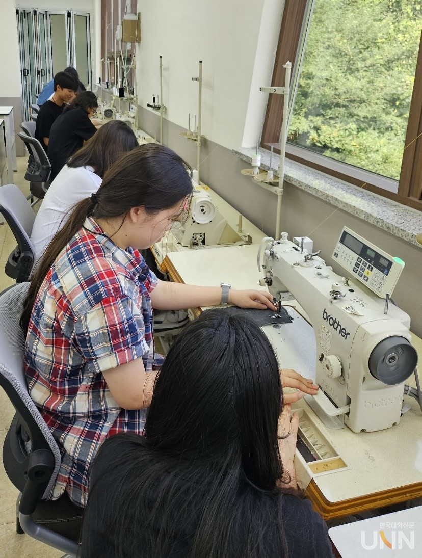 고등학생들은 전임교수들과 교직이수 예정학생인 최현지 학생을 포함한 재학생들의 도움을 받으며 처음으로 재봉틀을 활용한 봉재기술을 익혔고, 친환경 소재에 대한 이해 및 구성법을 학습한 후 각자의 취향대로 직물을 배색 후 숄더백 제품을 완성할 수 있었다.