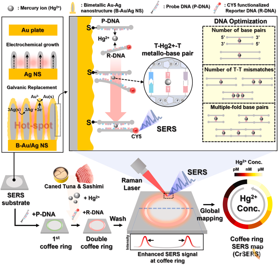연구팀은 특정 단일파장의 광원을 분석 시료에 조사해 결합 상태에 따른 진동 에너지의 변화를 고유한 스펙트럼으로 확인하는 라만 분광 기술을 사용했다. 특히 라만 신호를 극대화하기 위해 표면증강라만산란(Surface Enhanced Raman Scattering, SERS)을 적용하였고, 이는 분석 물질이 흡착된 기판의 나노 구조에 따라 성능이 결정된다. 이를 위해 연구팀은 바이메탈 나노 기둥 형태를 제작해 SERS 기판으로 사용하였고 SERS 기판 위에 DNA를 고정해 수은 이온을 민감하게 검출했다.