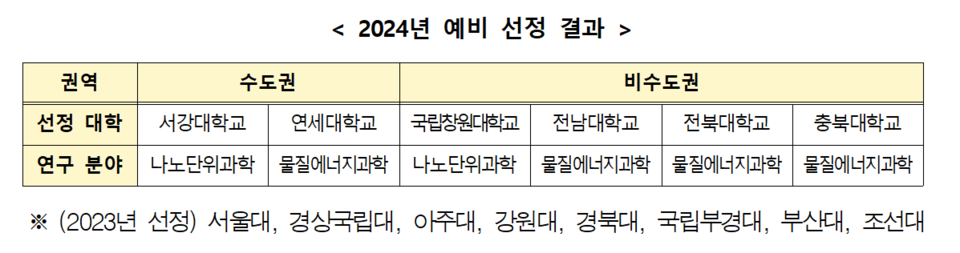 예비 선정 결과, 2024년에는 △서강대(나노단위과학) △연세대(물질에너지과학) △국립창원대(나노단위과학) △전남대(물질에너지과학) △전북대(물질에너지과학) △충북대(물질에너지과학) 총 6개교가 예비 선정됐다.