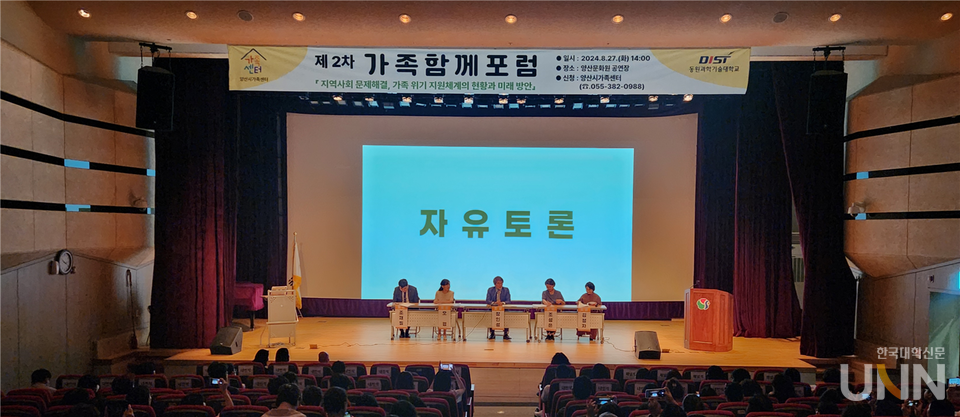 [한국대학신문 정수정 기자] 동원과학기술대학교(총장 손영우) 혁신지원사업단과 양산시 가족센터가 공동 주최한 ‘2024 제2차 가족함께포럼’이 지난 27일 양산문화원 공연장에서 성공적으로 개최됐다. 이번 포럼은 ‘가족위기 발생에 따른 지원 체계의 현황과 미래 방안’을 주제로 열렸다.