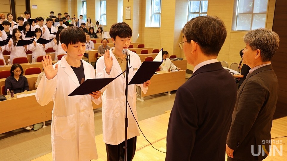 학생 대표로 디오스코리데스 선서를 한 이태훈 학생은 “약학의 전문인으로서 내 삶을 인류를 위해 바치겠다”고 다짐했다. 가톨릭대 약학대학장 조용연 교수는 “환자의 몸만 고치는 약사가 아니라 마음까지 치유하는 약사가 되길 바란다”며 학생들을 응원했다.