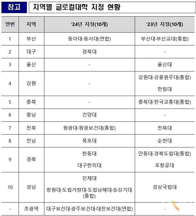 올해 글로컬대학 본지정 대학은 △건양대 △경북대 △국립목포대 △국립창원대‧경남도립거창대‧경남도립남해대‧한국승강기대(통합) △동아대‧동서대(연합) △대구보건대‧광주보건대‧대전보건대(연합) △대구한의대 △원광대‧원광보건대(통합) △인제대 △한동대 등 총 10곳이다.