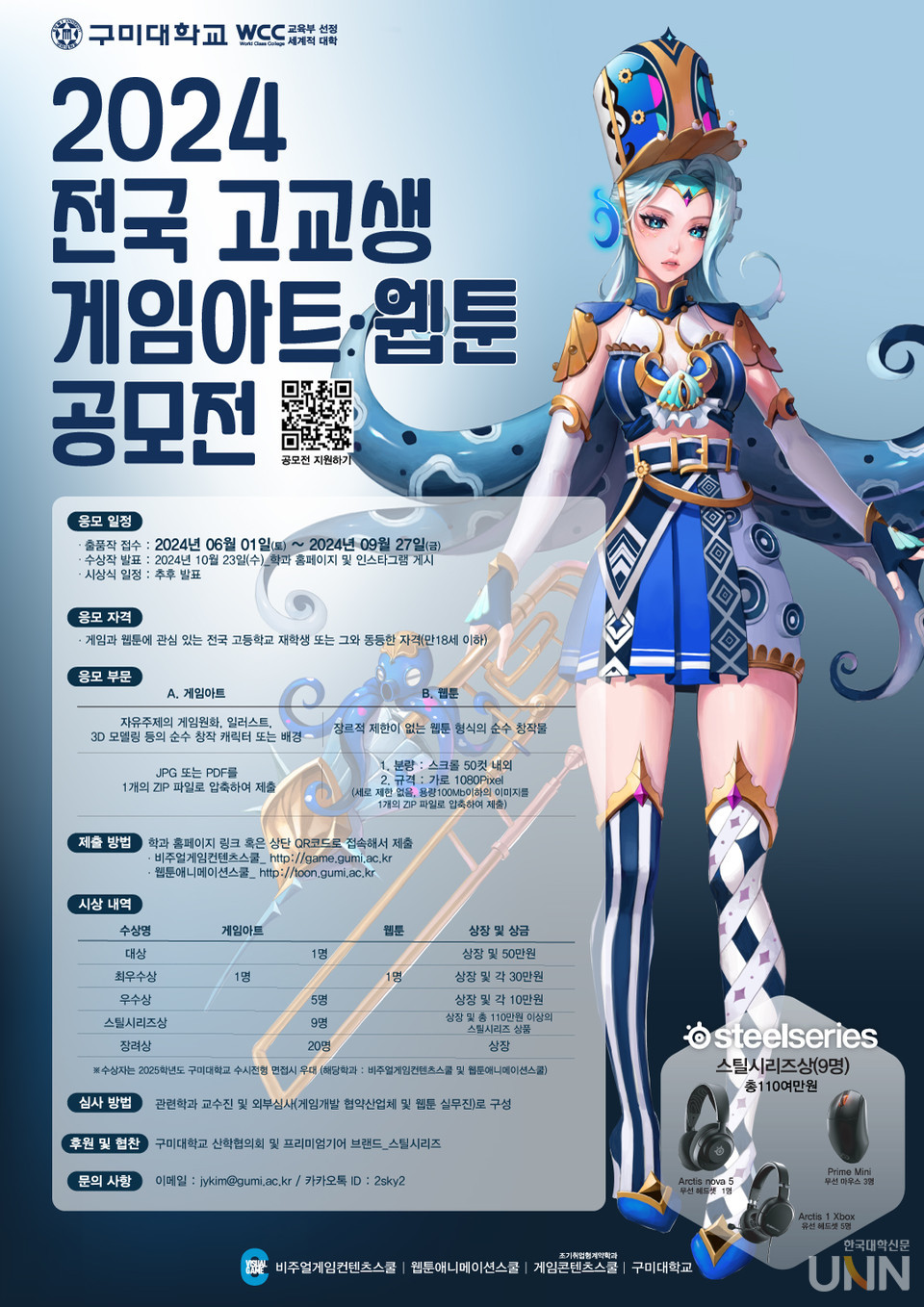 이번 공모전은 구미대 비주얼게임컨텐츠스쿨과 웹툰애니메이션스쿨, 게임콘텐츠스쿨(조기취업형계약학과)이 주관하고 스틸시리즈(프리미엄 게이밍 기어 브랜드)와 구미대 산학협의회 게임산업체에서 후원한다.