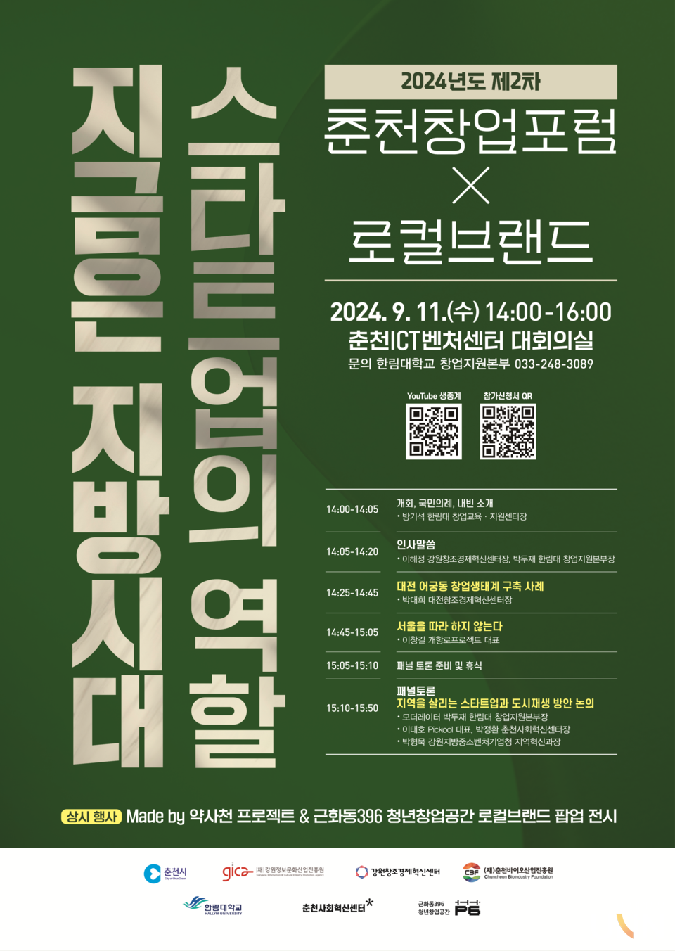 춘천시가 주최하고 한림대와 강원창조경제혁신센터, 강원정보문화산업진흥원, 바이오산업진흥원이 공동 주관하는 이번 포럼은 춘천 지역 내 창업생태계를 활성화하고 창업자들과 예비 창업자들에게 다양한 정보를 제공하기 위해 마련됐다.