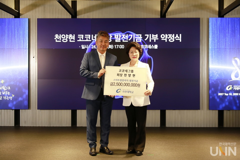 [한국대학신문 이정환 기자] 가천대학교(총장 이길여) 동문인 디지털컨텐츠 기업 코코네그룹 천양현 회장(법학86·전 NHN재팬 회장)이 스타트업칼리지 학생들의 창업 지원을 위해 발전기금 25억원을 기부키로 약정했다. 올해부터 2028년까지 매년 5억원씩 기부한다. 천회장은 가천대 스타트업칼리지 조성비 33억원과 코코네스쿨 운영비 1억 3천만원을 기부하는 등 이번 약정을 포함해 총 60억 3천만원을 기부하게 됐다.