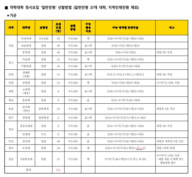 2025학년도 약학과 정시모집 일반전형은 37개 약대에서 모두 선발한다. 수도권 주요 사립대뿐만 아니라 지역 거점 국립대 등 지역적 분포도 다양하다. 일반전형이 633명, 지역인재전형이 가군 42명, 나군 44명, 다군 5명 총 91명뿐이어서 다른 수시모집 전형과 달리 지역인재전형 비율이 매우 적다. 약학과는 수학과 과탐의 영역별 반영 비율이 높고 수학(미적분, 기하)과 과탐 과목에 가산점을 주는 대학이 많은 점도 잊지 말자.