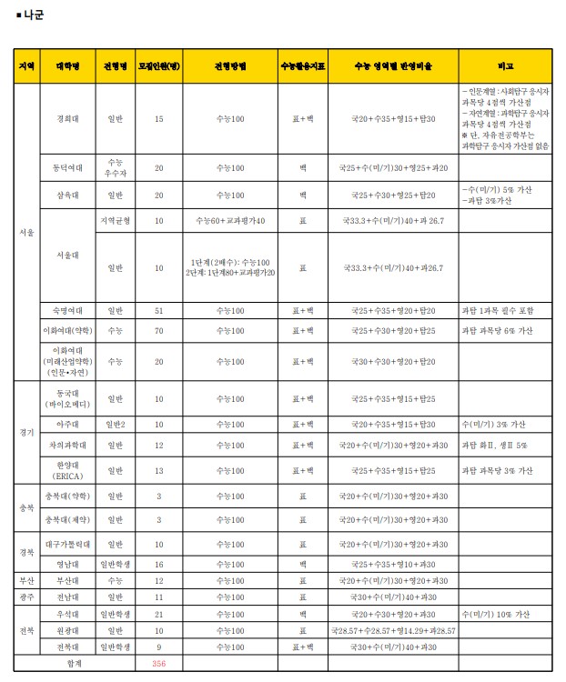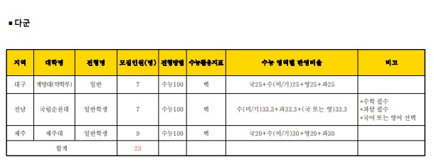 2025학년도 약대 모집군 변동도 확인해야 한다. 계명대는 2023학년도에 가군에서 제약학과 4명, 다군에서 약학과 4명을 분리 선발했지만, 2024학년도에 다군에서 약학부로 8명을 통합 선발하기 시작했으며 2025학년도에는 다군 약학부에서 7명을 선발한다. 충북대(약학과 4명, 제약학과 4명)는 가군에서 나군으로 모집군을 이동해 약학과 3명, 제약학과 3명을 선발한다. 충남대는 나군(5명)에서 가군(5명)으로 모집군으로 변경했다.