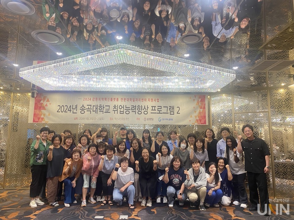 [한국대학신문 이정환 기자] 송곡대학교(총장 왕덕양)는 20~21일 양일간 잭슨나인스호텔 춘천에서 강원대학교 강원지역혁신플랫폼과 협업해 2024년 취업능력향상 프로그램 2를 진행한다. 학생들은 취업에 필요한 자기 소개서 작성법 컨설팅, 전문직에 대한 비전과 변화, 협업에 강한 ‘나’로 성장하기 등에 대한 교육을 받고 있다.
