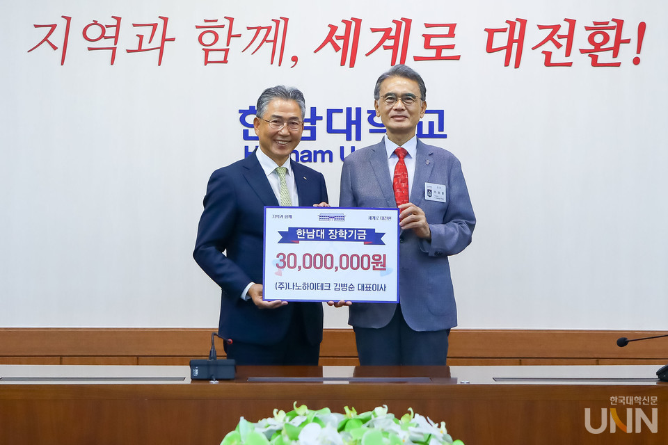 ㈜나노하이테크 김병순 대표는 20일 오전 한남대를 방문해 이승철 총장에게 발전기금 3000만원을 전달했다. 김 대표가 한남대에 기탁한 누적 기부액은 19년 동안 1억4200만원에 이른다.