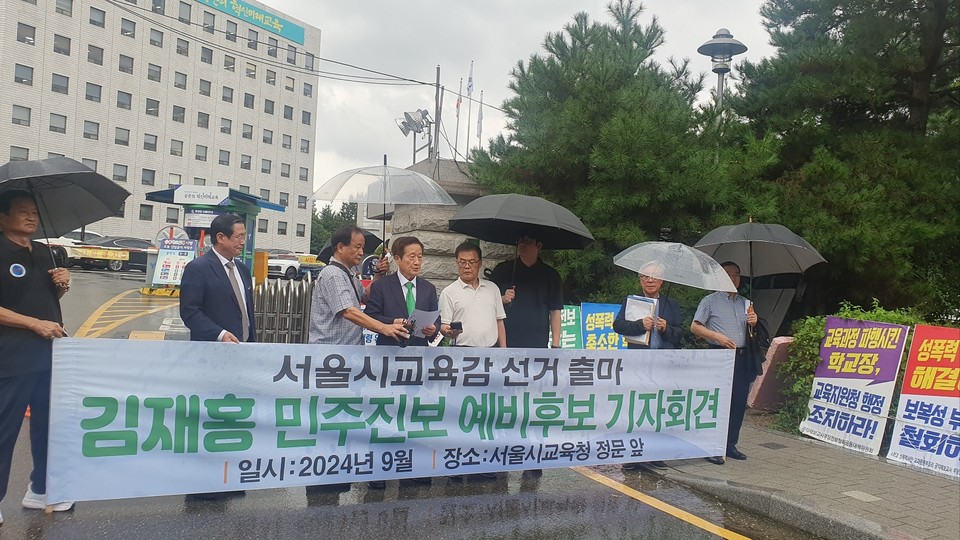 [한국대학신문 정수정 기자] 서울시교육감 선거 예비후보인 김재홍 전 17대 국회의원이 20일 오전 서울시교육청 앞에서 기자회견을 개최했다.