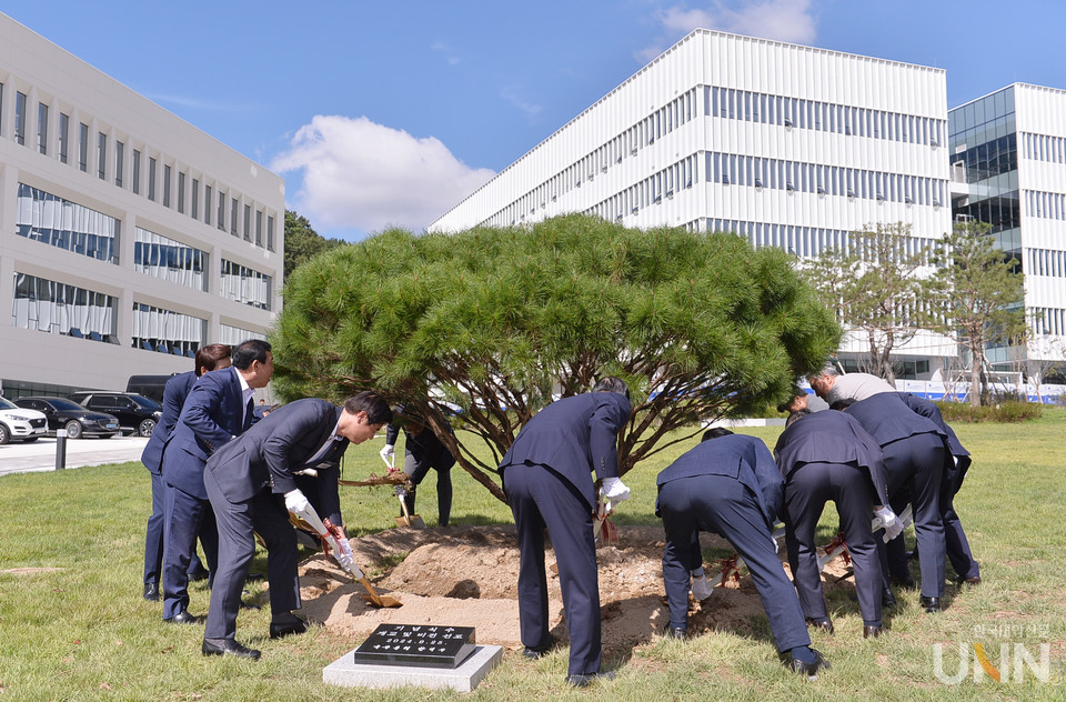 깃발 퍼포먼스와 함께 세종공동캠퍼스 법인기를 흔들고 있는 한석수 이사장.(맨 위) 한덕수 국무총리가 축사를 하고 있다.(두번째) 기념식수를 하고 있는 내빈들.(맨 아래)