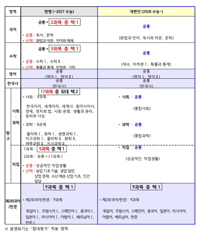2028학년도 수능 탐구영역의 문항 수·배점(문항당 배점 포함)·시험시간 등은 2025년 상반기 ‘2028학년도 수능 기본계획’ 발표 시 안내된다. 아울러 교육부와 평가원은 2028학년도 수능 체제 개편으로 인해 출제과목 등이 변동되는 영역의 전체 문항을 개발해 수능 기본계획과 함께 안내할 예정이다.