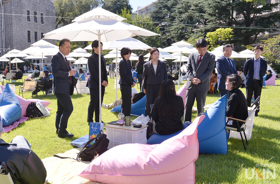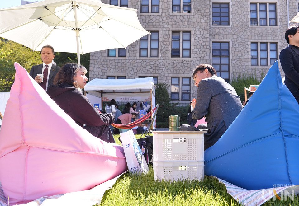 박 총장(두번째 오른쪽)이 행사에 참여한 외국인 유학생과 빈백 소파에 앉아 담소를 나누고 행사장을 둘러 보며 대화를 나누고 있다.(세번째)
