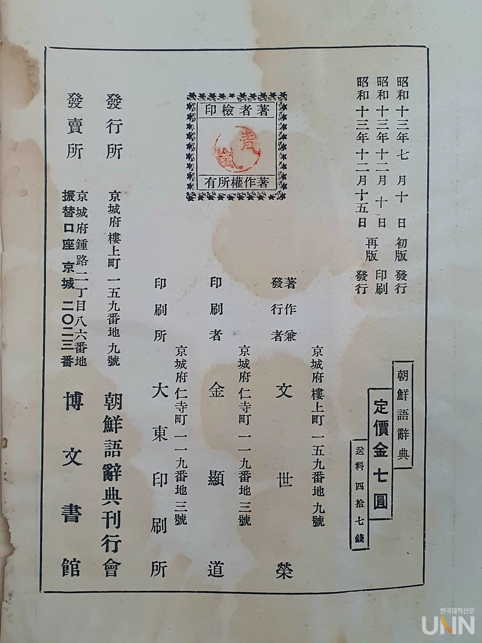 [한국대학신문 이정환 기자] 경상국립대학교(GNU·총장 권진회) 박물관(관장 정재훈 사학과 교수)은 하동군 옥종면의 고(故) 정찬화 선생이 소장해 온 우리나라 최초의 국어사전인 《朝鮮語辭典》(조선어사전) 1점을 최근 기증받았다고 밝혔다.