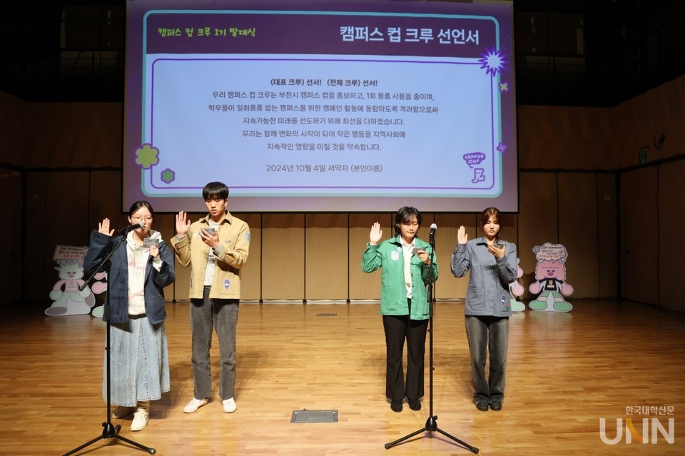 [한국대학신문 이정환 기자] 가톨릭대학교(총장 원종철)가 1회용품 없는 부천시를 만드는 대표 대학으로 앞장선다. 지난 4일 부천시 아트센터 소공연장에서 열린 ‘부천시 캠퍼스컵 크루 1기 발대식’에서 가톨릭대 재학생 15명이 친환경 서포터즈로 최종 선발돼 본격적인 활동을 시작했다.