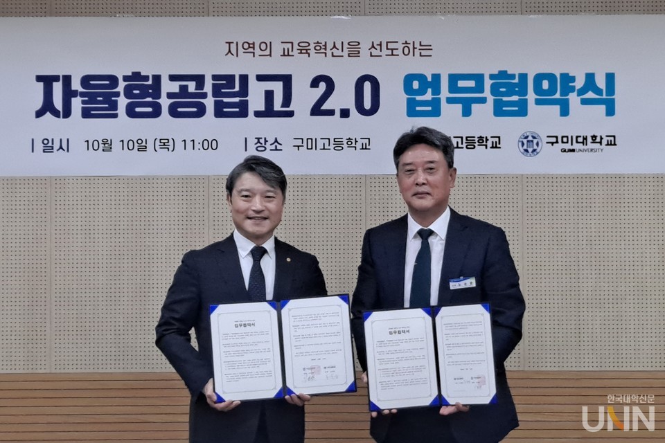 [한국대학신문 이정환 기자] 구미대학교(총장 이승환)는 구미고등학교(교장 노순광)와 자율형 공립고 2.0 사업의 원활한 추진을 위해 협약을 체결했다.