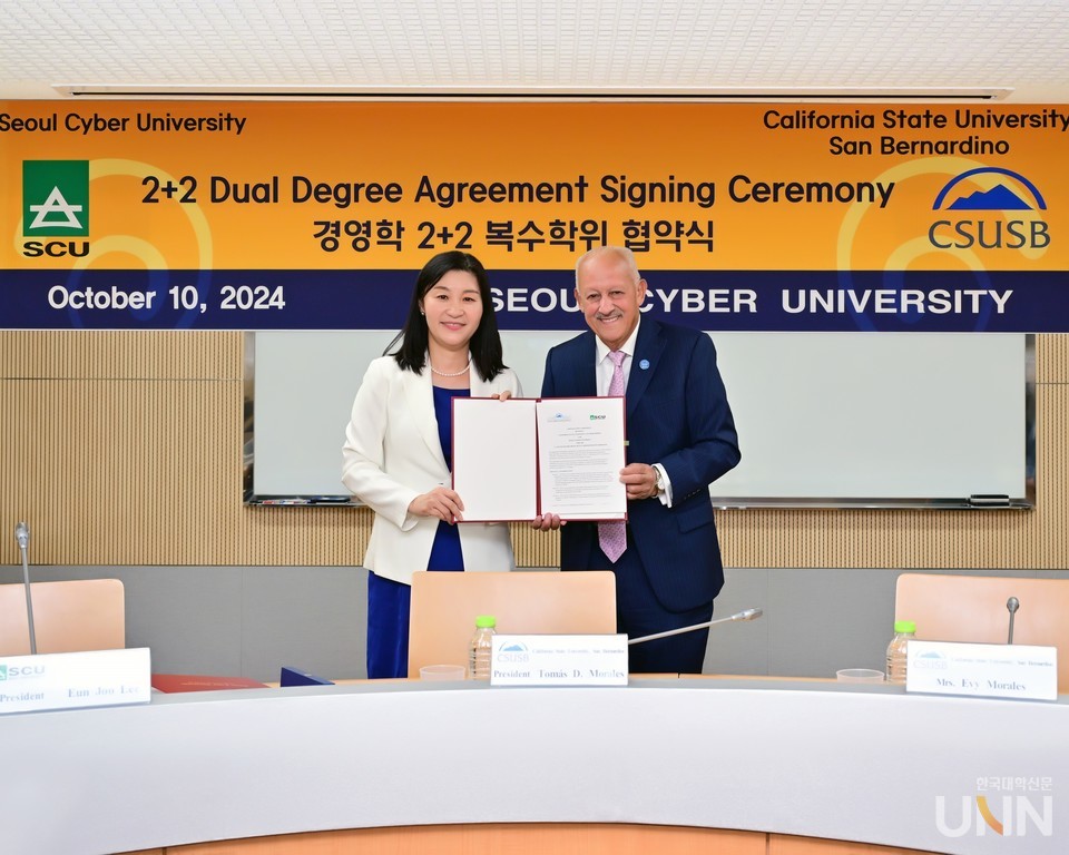 [한국대학신문 이정환 기자] 서울사이버대학교가 사이버대학교 최초로 미국 캘리포니아 주립대 샌버나디노(총장 토마스 모랄레스, California State University San Bernardino-이하 CSUSB)와 10일 서울사이버대에서 온라인 복수학위 협약을 체결하였다.