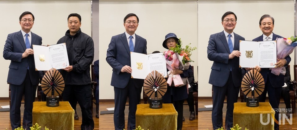 [한국대학신문 이정환 기자] 서울대학교(총장 유홍림)는 제34회 자랑스러운 서울대인 수상자로 故김민기 학전 대표, 정영선 조경설계 서안㈜ 대표, 홍석현 중앙홀딩스 회장을 선정했다. 수여식은 14일 제78주년 서울대학교 개교기념식에서 진행했다.