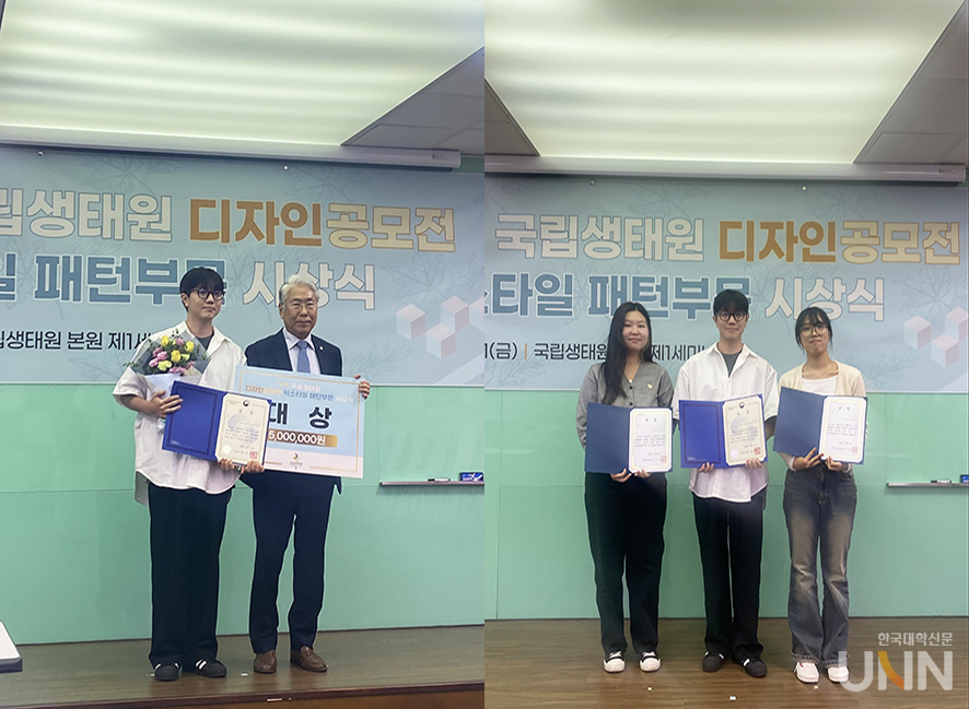 [한국대학신문 이정환 기자] 국립군산대학교 산업디자인학부 2학년 김유성 학생이 국립생태원이 주최한 제1회 국립생태원 텍스타일디자인공모전에서 대상인 환경부장관상(상금 500만원) 수상하고 2학년 조현아 학생은 은상(국립생태원장상, 상금 100만원), 4학년 이상진 학생, 2학년 박예슬 학생은 ‘특선‘을 수상했다.