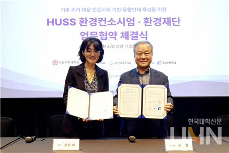[한국대학신문 이정환 기자] 국민대학교(총장 정승렬)가 주관대학으로 참여하고 있는 HUSS 환경컨소시엄(국민대‧덕성여대‧울산대‧인하대‧조선대, 이하 환경컨소시엄)과 재단법인 환경재단이 기후 위기 대응을 위한 인문사회 기반 융합인재를 육성하고자 지난 4일 인천 네스트호텔에서 업무협약을 체결했다.