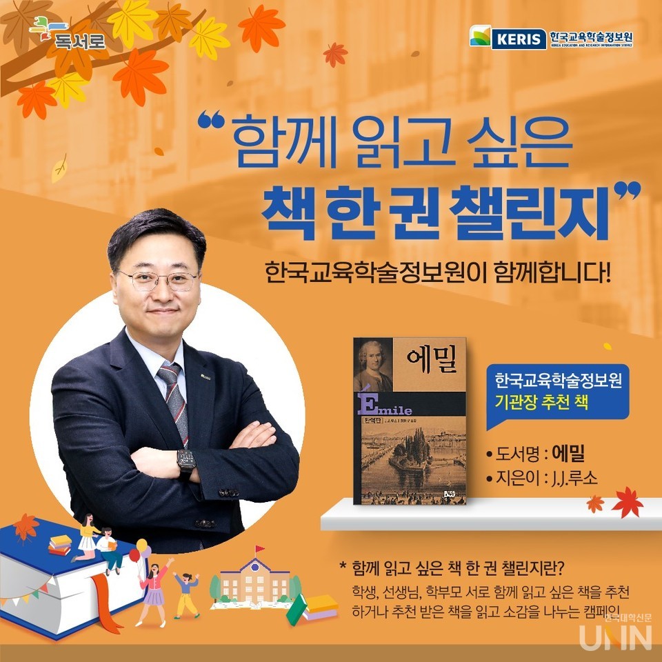 [한국대학신문 정수정 기자] 한국교육학술정보원(원장 정제영)은 21일부터 독서문화 확산을 위해 ‘함께 읽고 싶은 책 한 권’ 독서 챌린지를 진행한다.